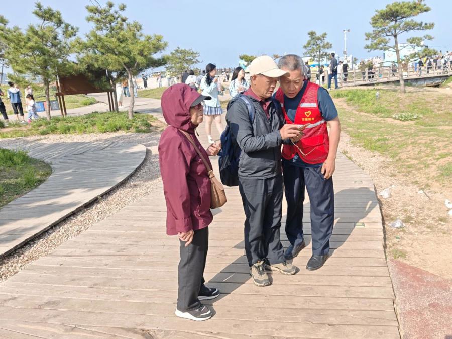 在陽光海岸景區(qū),鮮紅的志愿者馬甲和蔚藍天空交相輝映。志愿者們面向廣大游客熱情提供問路、咨詢等便民服務(wù),有禮進行文明引導(dǎo),同時協(xié)助開展環(huán)境清潔與秩序維護等活動。