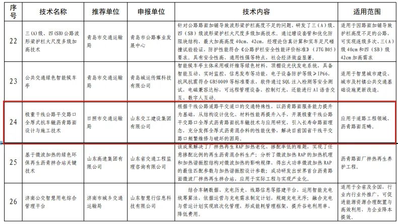 近日,山東省交通運(yùn)輸廳發(fā)布2025年度《山東省交通運(yùn)輸科技成果推廣目錄》,集團(tuán)所屬山東交建集團(tuán)申報(bào)的《極重干線公路平交路口全厚式抗車轍瀝青路面設(shè)計(jì)與施工技術(shù)》成功入選。