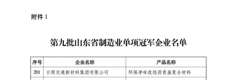 近日,省工信廳公布了第九批山東省制造業(yè)單項冠軍企業(yè)名單,新材料集團憑借“環(huán)保凈味改性瀝青基復(fù)合材料”產(chǎn)品,榮獲“山東省制造業(yè)單項冠軍企業(yè)”稱號。