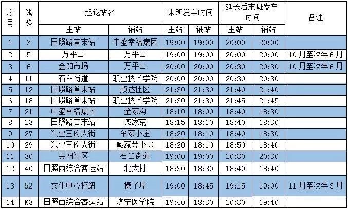 為進(jìn)一步助力我市夜間經(jīng)濟(jì)、中央活力區(qū)發(fā)展,優(yōu)化夜間餐飲、商超、文旅消費(fèi)集聚區(qū)公交配置,滿足人民群眾夜間乘車需求,圍繞夜間城區(qū)客流特點(diǎn),我公司經(jīng)過反復(fù)研究,經(jīng)上級主管部門同意,定于2020年1月17日起延長公交3路、5路、6路、11路、12路、18路、21路、23路、27路、29路、30路、40路、52路和K3等14條線路的末班發(fā)車時間,具體如下: