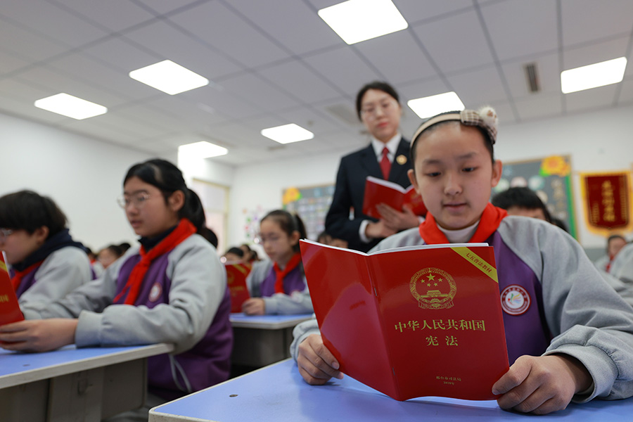 2025年12月2日,在河北省邢臺(tái)市內(nèi)丘縣朝陽(yáng)小學(xué),內(nèi)丘縣人民檢察院檢察干警為學(xué)生講解憲法知識(shí)。新華社發(fā)(劉繼東攝)
