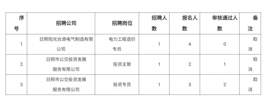 2022年日照交通能源發(fā)展集團(tuán)公開招聘報(bào)名、資格審核工作已于2022年8月26日結(jié)束。根據(jù)《日照交通能源發(fā)展集團(tuán)有限公司公開招聘工作人員簡章》規(guī)定,若通過資格審核和業(yè)績?cè)u(píng)價(jià)人員不足崗位3倍的,取消或核減招聘崗位計(jì)劃。現(xiàn)將取消招聘崗位情況予以計(jì)劃招聘人數(shù)公告。
